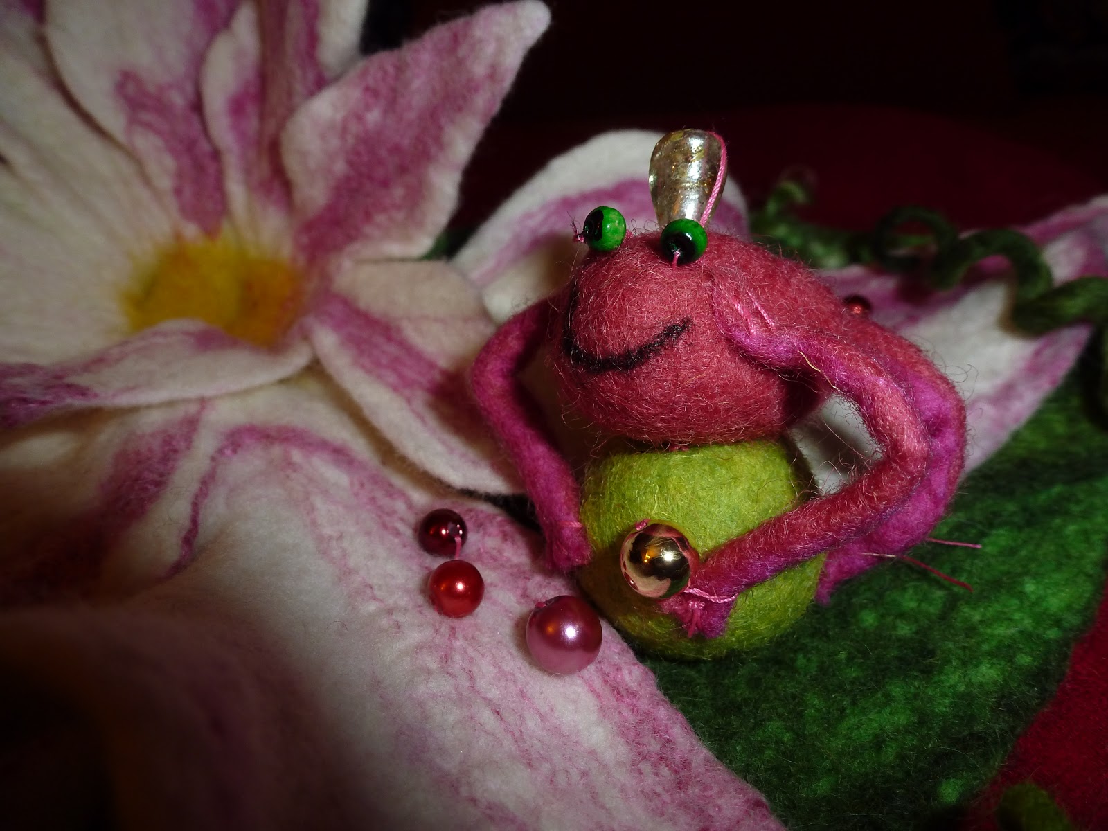 Froschprinzessin aus Bergschafvlies - Blüte und Blatt aus Merinovorfilz